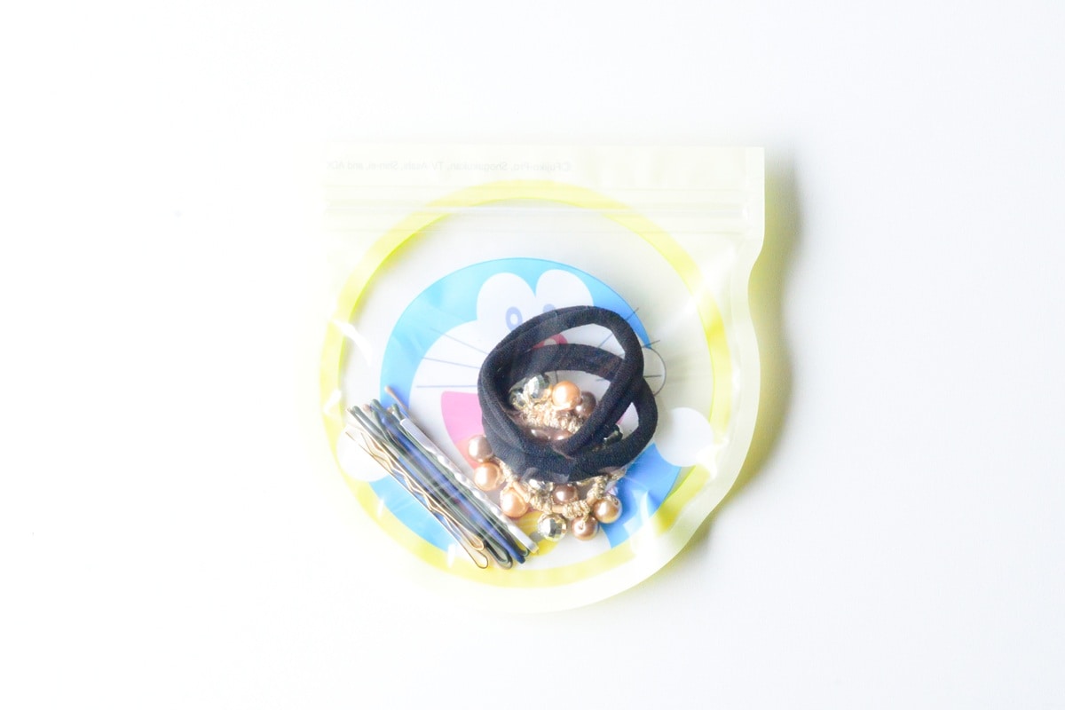 ヘアゴムとヘアピンを入れてみました。ドラえもんの背後にちらっと中身が見えるのがいい感じ。