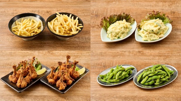 (左上から時計まわり)ポテトフライ、マカロニサラダ カレー風味、枝豆、チューリップから揚げ