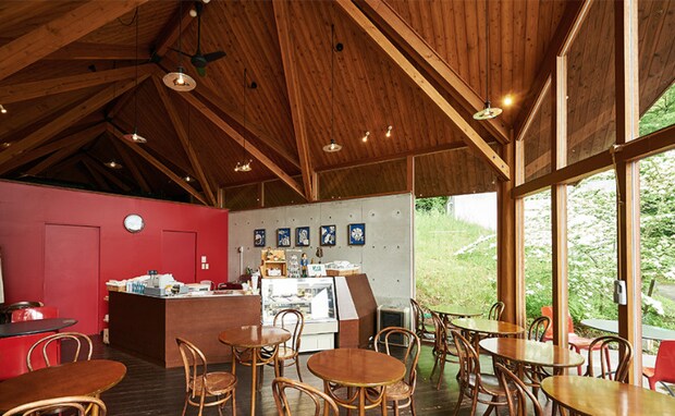 カフェの名前となった「ルーエ(Ruhe)」は、ドイツ語で「静けさ・憩い」を意味します。緑豊かな自然に囲まれた開放的な空間は、園内散策の合間にほっと一息つけるスポットです。