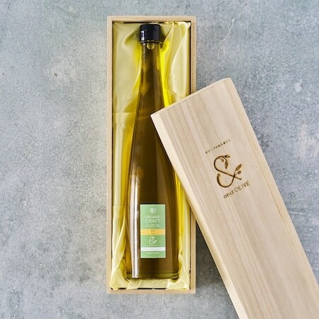 2025年5月にLIOOC(ロンドン国際オリーブオイルアワード)のインフューズドオリーブオイル部門で銀賞を受賞した製品と同じ製法で生産したオリーブオイルを、500本限定で美しいボトルに封入し、数量限定生産の証としてシリアルナンバー(製造ロットナンバー)が刻印された桐箱に納めて届けられる。