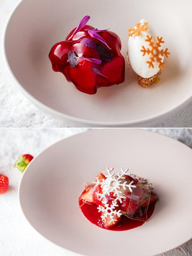 スタンダードプランのみで提供される、メレンゲの軽やかな食感が楽しい「あまりんのパブロバ」は、ブランドいちご「あまりん」とハイビスカスのゼリーシート、花びらの彩りが添えられた華やかな1皿。ミルクソルベと雪の結晶型のチュイルが、冬の澄んだ空気を思わせる繊細な世界観を表現している。