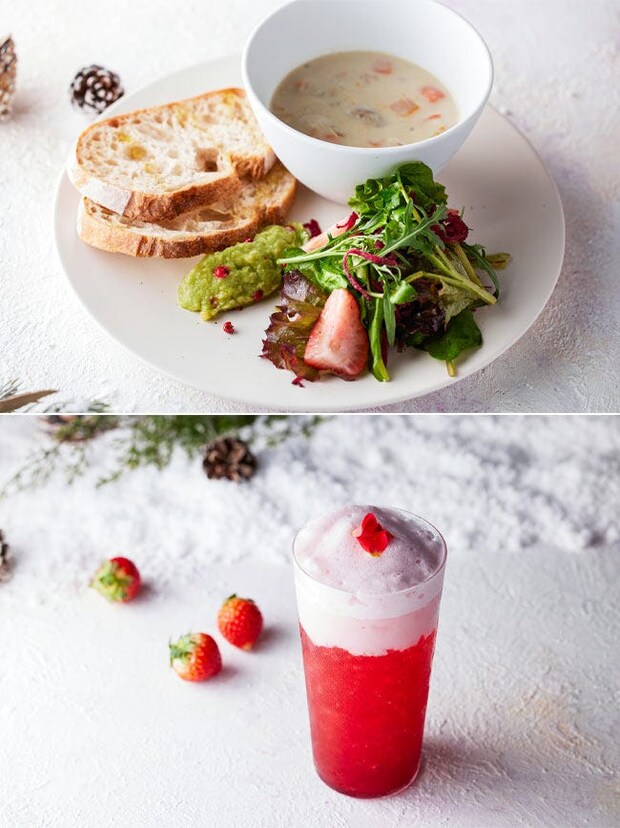 スイーツに加えて、大ぶりにカットされた具材が食べ応え抜群の「クラムチャウダー」や、フランボワーズドレッシングを合わせた「苺とビーツのサラダ」などのセイボリーが用意されるのもうれしいポイント。