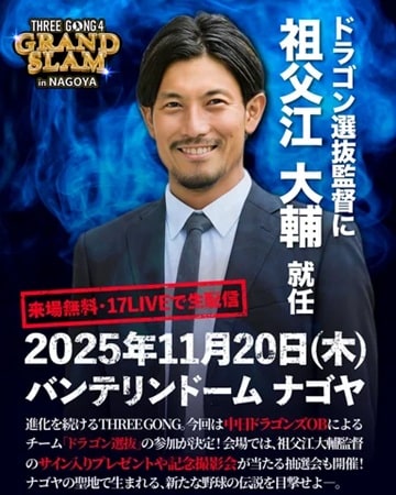 そして、元中日ドラゴンズ・祖父江大輔さんが「ドラゴン選抜」の監督に就任決定。2013年に入団して以来、長くドラゴンズのブルペンを支え続けた右腕が、今度は監督としてバンテリンドーム ナゴヤに戻ってくる。現役時代のチームメイトとともに「THREE GONG」の歴史に新たなドラマを生み出す。