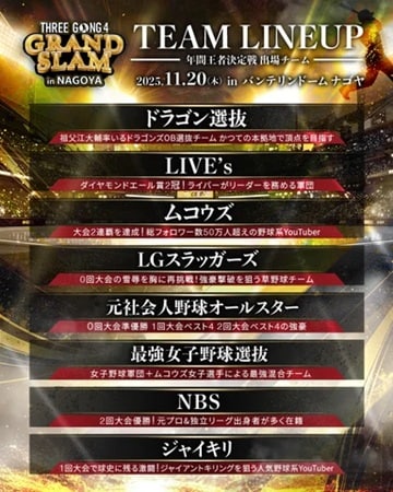 さらに、過去大会で激戦を繰り広げたYouTuberチーム「ジャイキリ」、全国の強豪チームで活躍した社会人経験者が集う「元社会人野球オールスター」、そして17LIVEの人気ライバーが率いる「LIVE’s」が参戦。