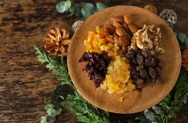 進々堂の「シュトーレン」は、レーズン・クランベリー・オレンジ・レモンの4種のドライフルーツとアーモンド・クルミの2種のナッツをふんだんに使ったとてもリッチな「シュトーレン」だ。また、アーモンド粉末と砂糖をペースト状にかためた「マジパン」を生地にたっぷり練り込むことで、香り高くしっとりした生地に仕上げられている。
