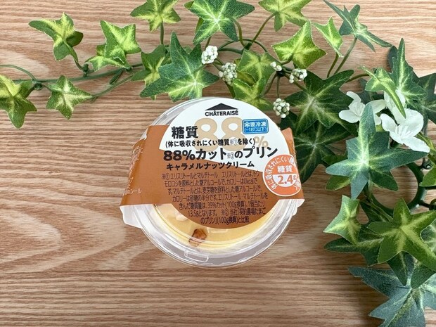 シャトレーゼの「契約農場たまごのプリン」と比較して88%の糖質削減を実現し、1個あたりの糖質量を2.4g(エリスリトール、マルチトール除く)に抑えています。