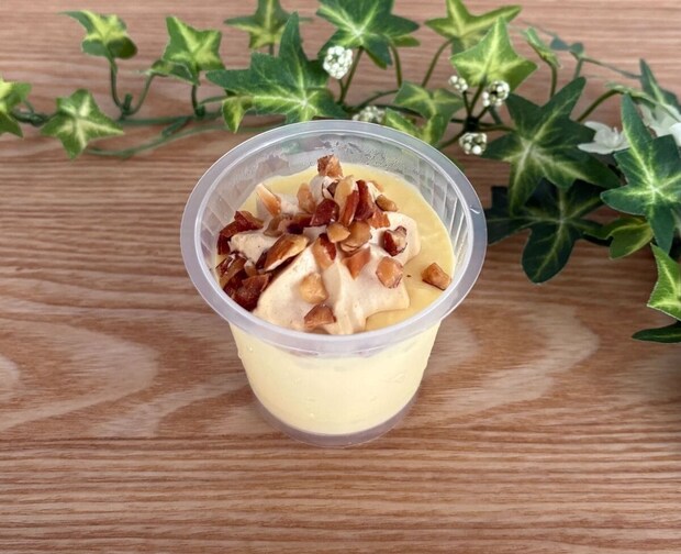 純生クリームを使ったプリンをベースに、ほんのりビターなキャラメル風味の純生クリームを乗せ、アクセントとしてナッツをトッピングしています。
