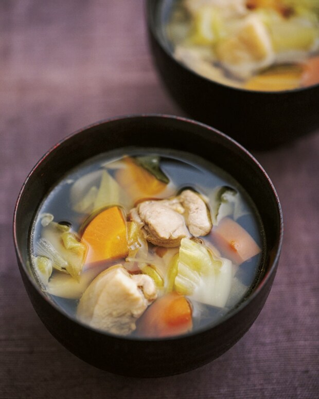 POINT1:野菜スープをぐらぐら沸騰させたくないので、鶏もも肉は先に入れて火を通しましょう。お好みで豚肉でも、白身魚や貝でも美味。キノコなどを足しても味わい深くなります。
