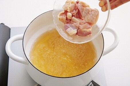 2 鶏もも肉、塩、しょうゆを入れ、鶏もも肉に火が通ったら基本のスープを入れる。