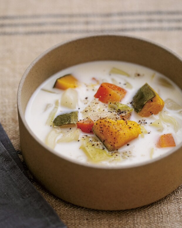POINT2:牛乳でぐっとコクをプラス。このときにハムやソーセージを加えれば食べ応えもアップ。すりおろしたジャガイモや、アサリでクラムチャウダー風にしても。