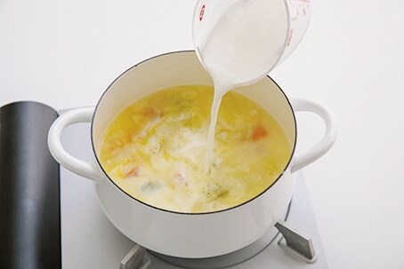1 鍋に基本の野菜スープを入れて温め、牛乳を加える。