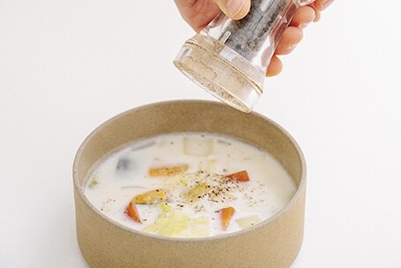 POINT1:味が足りなければお好みでお塩をプラスして。粉チーズで塩味をプラスしてもいいですが、野菜の出汁がミルクと溶け合い、比較的塩分控えめでも楽しめる一品です。