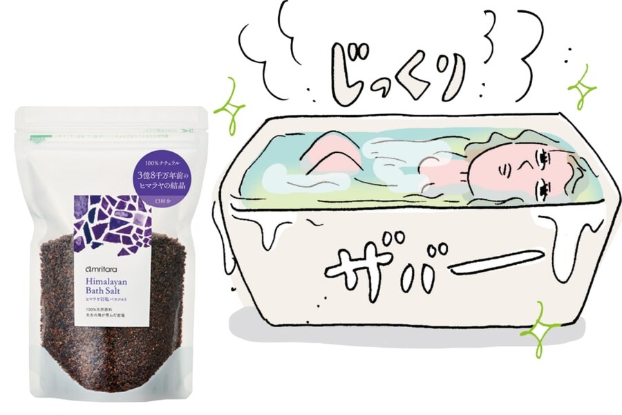 「肩コリって、頭のコリから来ていることが多いと思うんです。アムリターラの硫黄が香る入浴剤を入れたお風呂に頭のてっぺんまで潜ると、吸着作用のおかげか本当にすっきりとする。頭や肩がすーっと軽くなりますよ。ちなみにこの入浴剤は、電磁波対策にもなると噂です。あとは、ロールオンのCBDを頭皮に直接ぐりぐりと塗って、頭を揉みほぐすのも効く」
