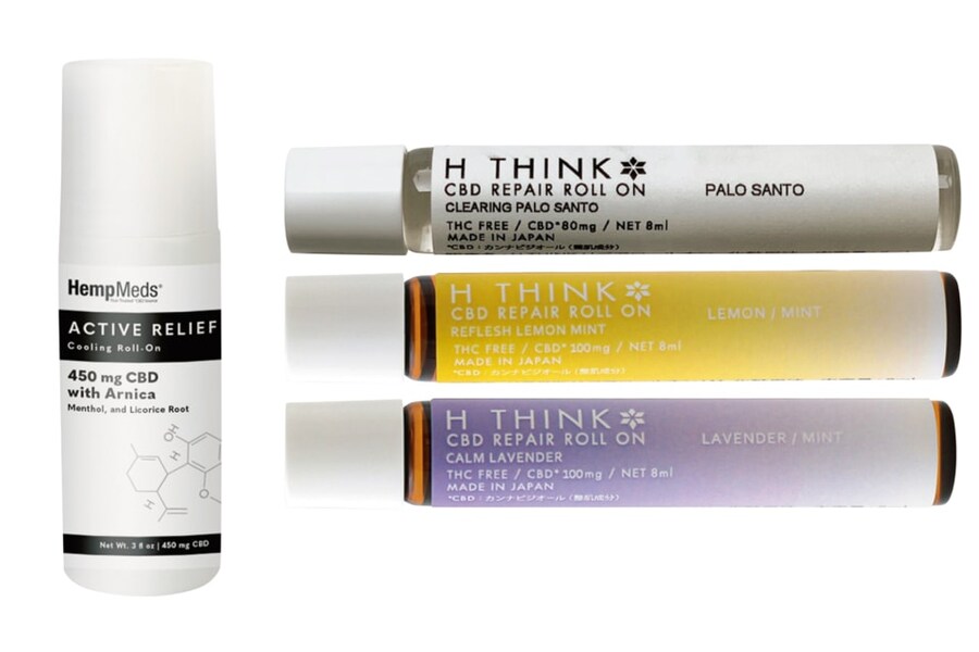 左:HempMeds CBDアクティブレリーフ クーリングロールオン 88mL ¥7,980、右:ポーチに常備したい。上から:H THINK CBDリペアロールオン クリアリングパロサント、リフレッシュレモンミント、カームラベンダー 各8mL ¥2,200(全てビープル バイ コスメキッチン)