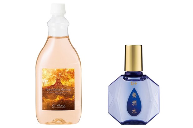 左:8000年以上前の腐植土から抽出したフルボ酸が主成分。フルビック アースミネラル 1L ¥6,804(アムリターラ)、右:睡眠中に角膜の修復をサポート。ロート養潤水α [第3類医薬品] 13mL ¥968 (ロート製薬)