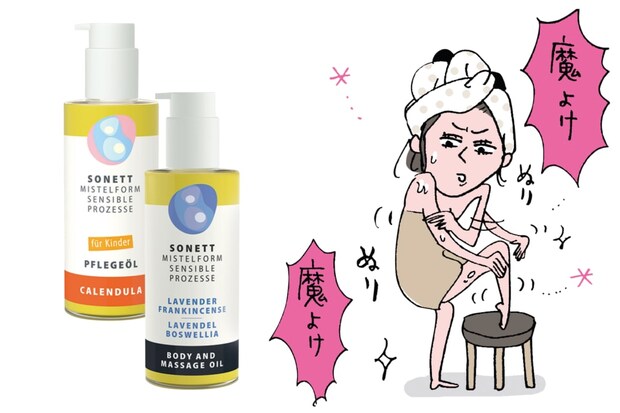 ベースはオーガニックのオリーブオイルと保水力の高いラノリン。自然な芳香にも癒やされる。左から:ソネット ヤドリギキッズケアオイル カレンドラ、同 ヤドリギマッサージオイル ラベンダー 各145mL ¥4,400(共におもちゃ箱)