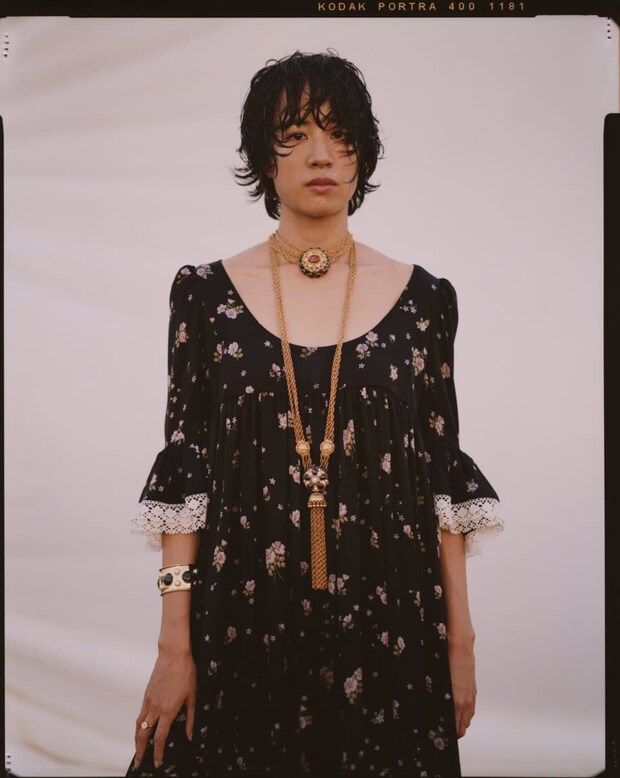 「撮影のイメージをスタイリストの小嶋(智子)さんに伝えて相談を重ねたところ、予想を超える形で彼女の中の夢と現実を絶妙に縫っていく素敵なスタイリングを提案してくれました。静河さんの都会育ちの洗練と無邪気な野性みと、洋服が持つ軽やかなロマンティシズムのマッチ。さらに今回その世界観に神話的メタファーで、夢見心地の世界に広がりを添えてくれたのが(フローリストの)大和(佳克)くんでした」