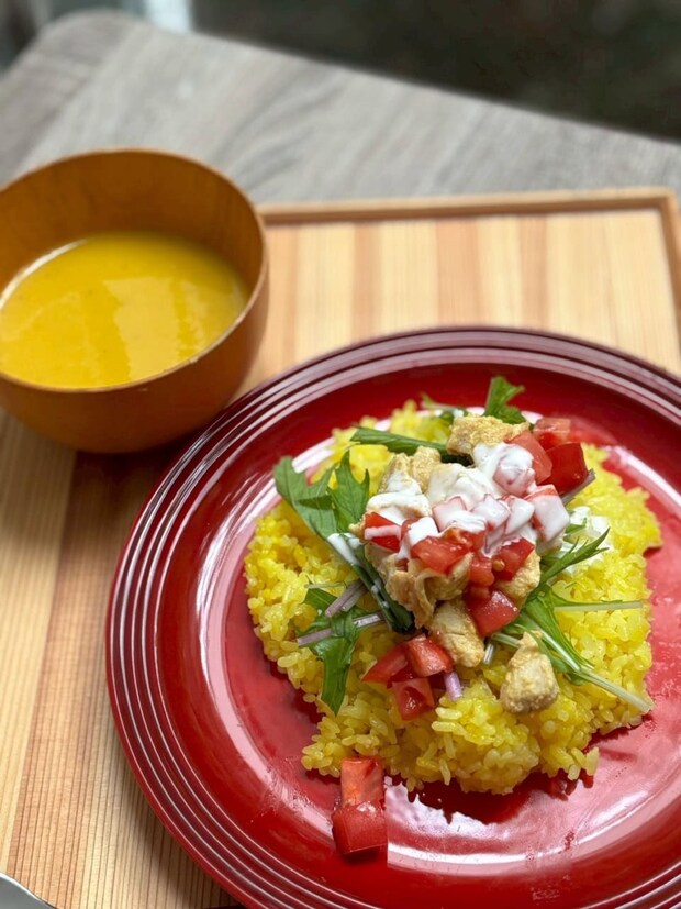 毎年恒例の人気イベントとあって、この日はいつも以上にオープンと同時に可愛い子たちがいっぱい来てくれて、すぐにお店は満席に☺️ ランチメニューはチキンオーバーライス&かぼちゃのポタージュ。スタッフひろこが「これ作りたい!」と教えてくれたコウケンテツさんのレシピを参考にチキンオーバーライスに初挑戦しました。