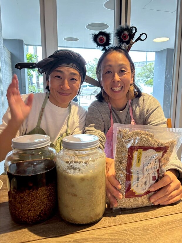左がひろこで、右が真理子。2人で仲良くひしお作り! 次回の【レインボー】でお土産に渡せるようにと清水さんからたくさんの【ひしおの素】をいただいたので、手軽に作ってもらえるようにこの日はひしおの動画をメイキング動画を撮影。みんな上手に作って活用してね!