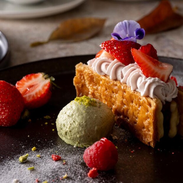 しっかり焼き込んだサクサクのパイで濃厚なカスタードクリームとラズベリージュレを挟み、ストロベリークリームの上に真っ赤ないちごやラズベリーをちりばめている。かわいらしいいちごとピスタチオアイスクリームのグリーンが華やかで、まるでクリスマスのプレゼントのような心躍る1皿をお楽しみに。