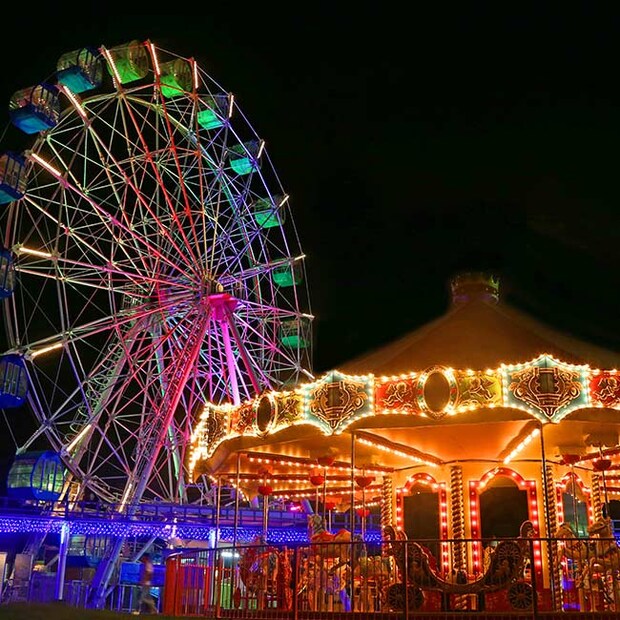 きらめく夜の遊園地で、アトラクションを満喫しよう。