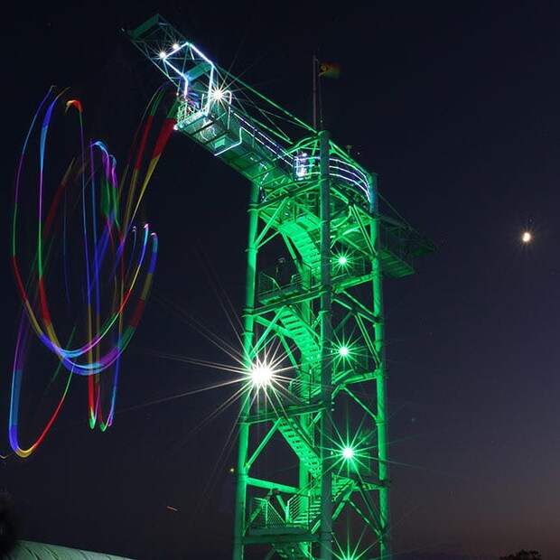 この時期だけのスリルあふれる「ナイトバンジー」も。タワーの高さ21m、標高を合わせると321mの高さから、イルミネーション輝く夜空へと飛び込んでいく。