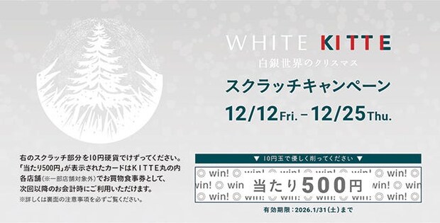 12月12日(金)から25日(木)の期間、「WHITE KITTE」スクラッチキャンペーンを実施するので、イルミネーションと合わせてこちらもチェックしてみて。