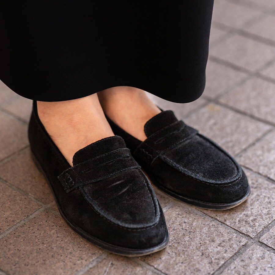 『マノロ ブラニク』のスウェードローファーが、足元から秋らしさを演出。シックなデザインで、モノトーンコーデを格上げしてくれる。
