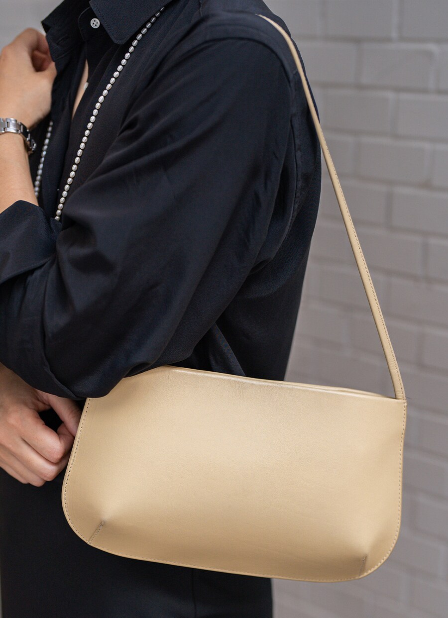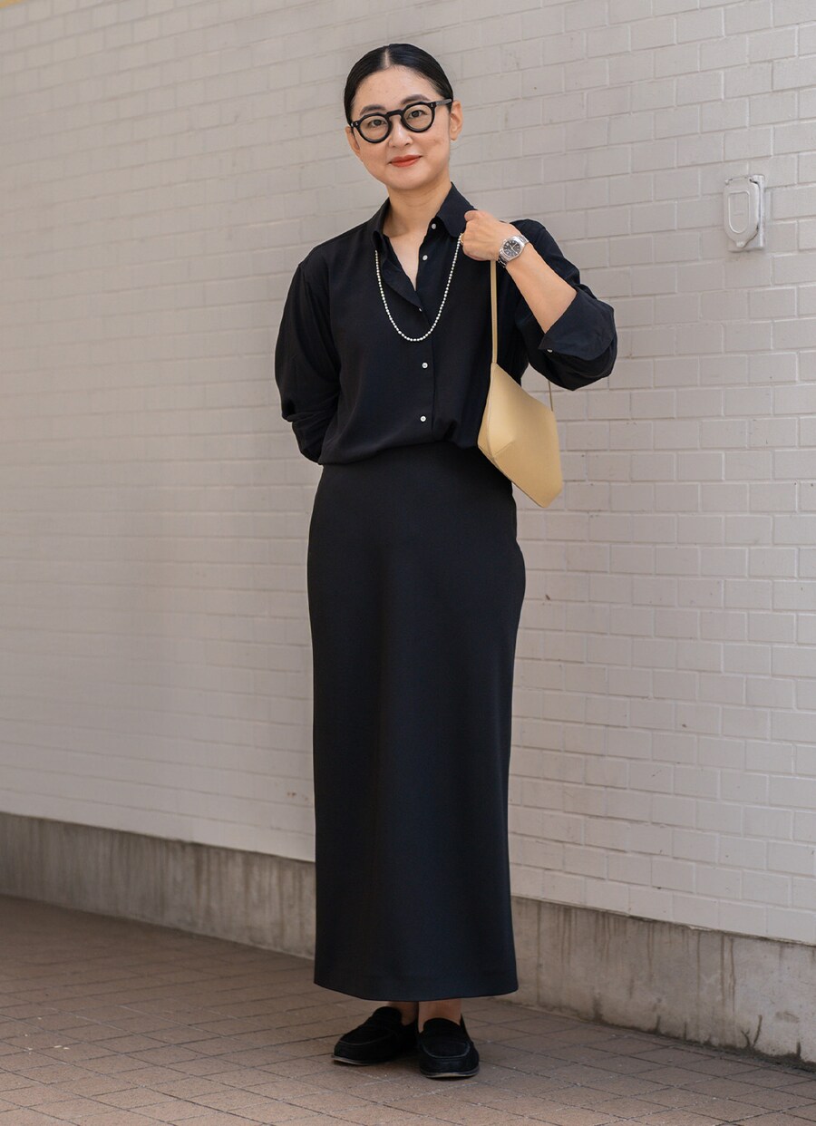 『ファーネ』のレザーバッグが、ブラックコーデの挿し色役に抜擢! シンプルなフォルムながら上質な素材感が漂うアイテム。