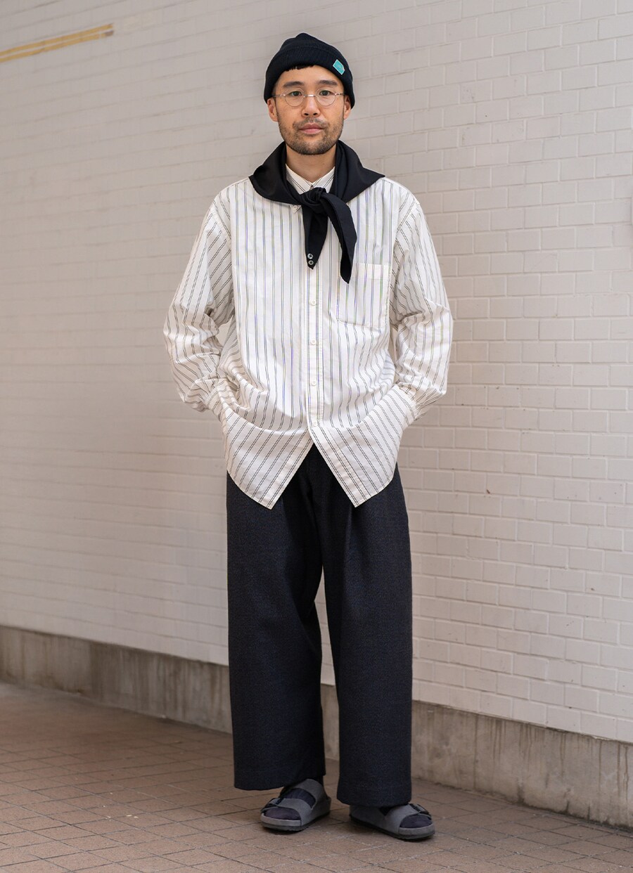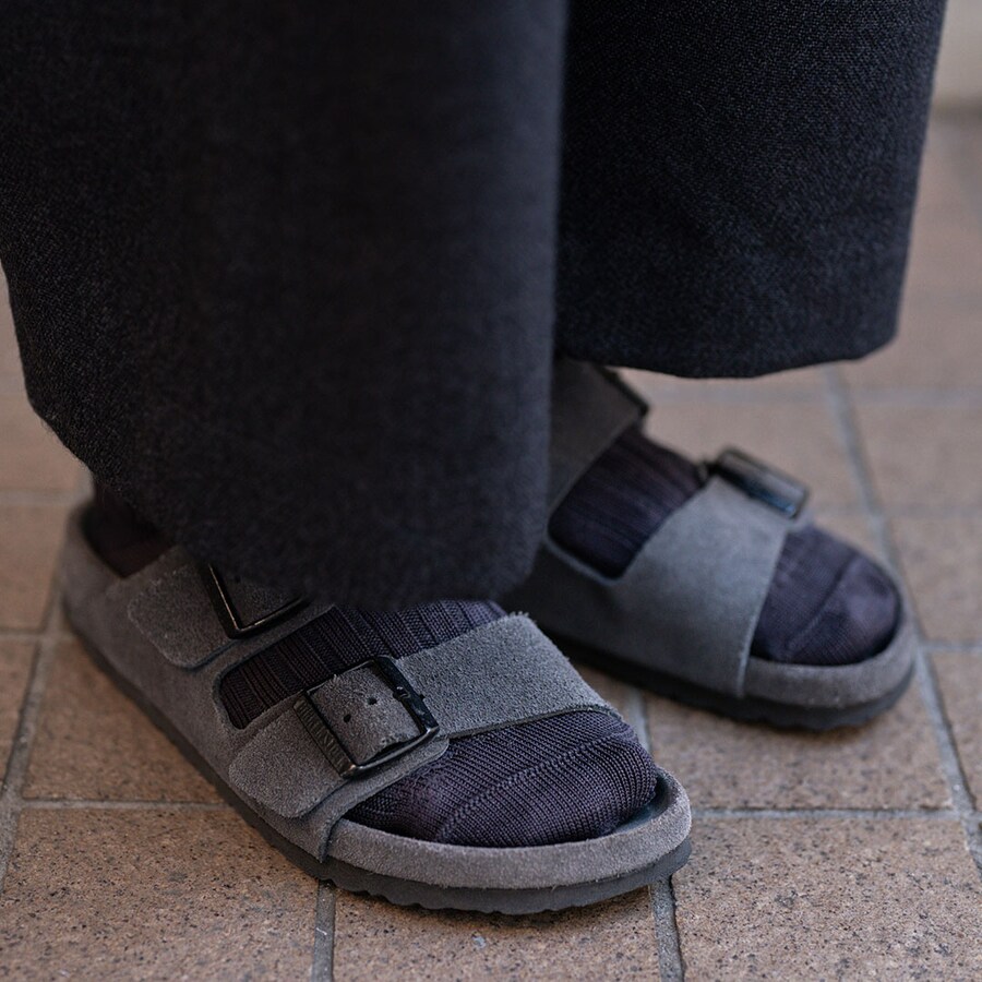 サンダルとソックスを合わせたオールブラックなスタイリング。真面目なシャツコーデに、足元はほどよく肩を抜いてバランスをとったのがポイント。