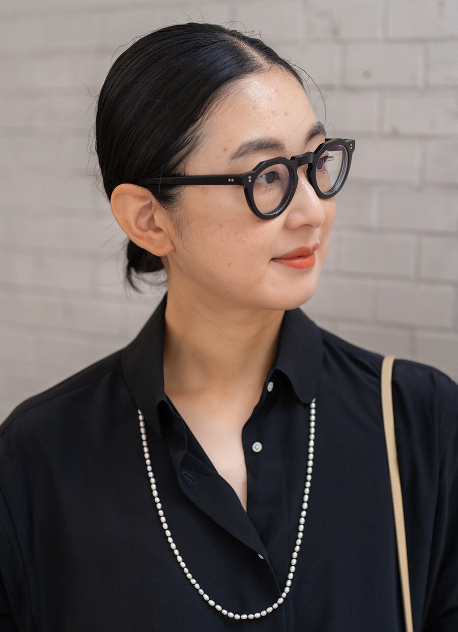 コンサバになりすぎないよう、マニッシュな黒縁メガネで外したのがグッド! 繊細なネックレスとレッドリップでレディに仕上げて。