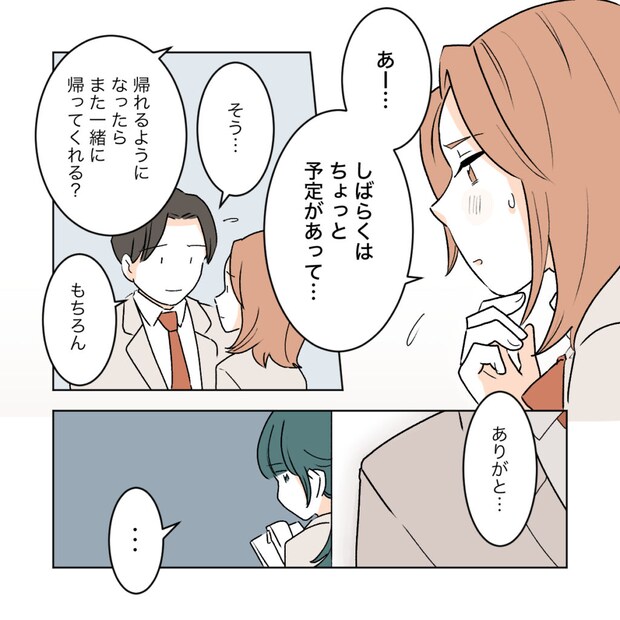カエデはまた口ごもりました。「あー、しばらくはちょっと予定があって。」と視線を外すと、「帰れるようになったらまた一緒に帰ってくれる?」と、まっすぐにワタルを見つめました。「もちろん」「ありがと・・・」そんな2人が両想いなのは見ていてわかります。私はさりげなく2人の会話を聞いていました。