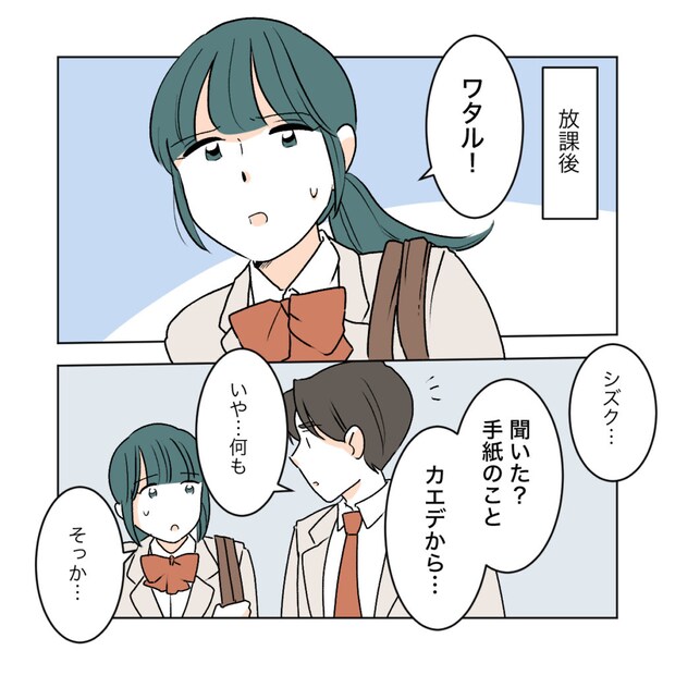 放課後、私はまたワタルに声をかけました。「聞いた?手紙のことカエデから・・・」会話を聞いていたことは秘密にして、確認すると「いや・・・何も。」とワタルは言いました。