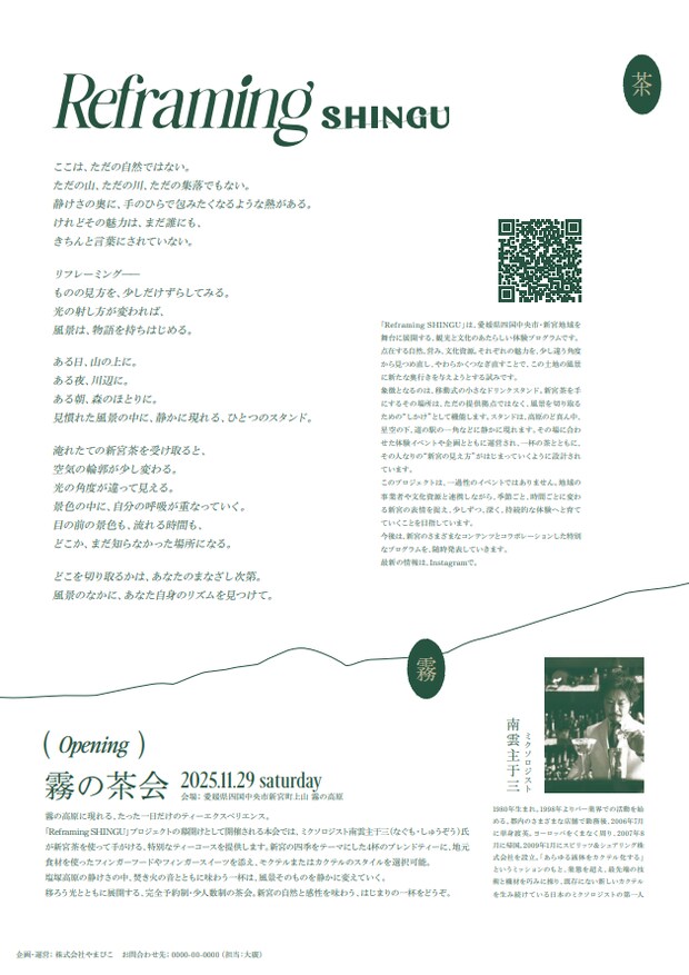 「Reframing SHINGU」プロジェクトでは、今後も新宮茶が育まれた豊かな自然環境を活かした体験や、地域の歴史・文化に触れるコンテンツが予定されています。霧の茶会での移動式スタンドデビューを皮切りに、四国中央市新宮町の新たな魅力に光が当てられていきます。
