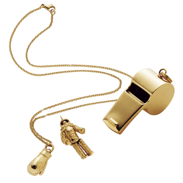 日本ではアパルトモンのみで取り扱うブランド。ホイッスルのペンダントトップ¥440,000、スペースマンのペンダントトップ¥583,000、グローブ付きペンダント¥407,000(全てイラリア イカルディ)