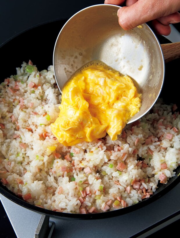 卵は半熟状に火を通して一度取り出す&仕上げに加えることが大事。チャーハンに欠かせない、ふわふわ食感をキープできます。