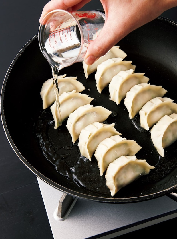 餃子の下側に焼き色がついたら、水を加えて蒸し焼きにします。中まで火が入りやすくなり、ふっくらジューシーな食感になる。