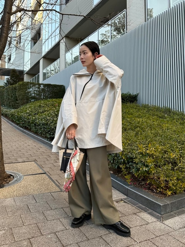 「ボリュームのあるポンチョタイプのアウターがカジュアルな雰囲気なので、小物で女性らしさをプラスしました。アイボリーカラーにカーキのボトムでトーンを合わせながら、足元はトラッドなローファー、バッグにはスカーフを結んで上品な印象のアウトドアスタイルに」