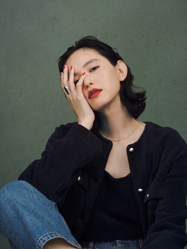 カーディガンジャケット¥39,600、中に着たタンクトップ¥17,600(共にグリードインターナショナル/グリードインターナショナル トウキョウストア)、デニムパンツ¥25,850(サージ/ショールーム セッション)