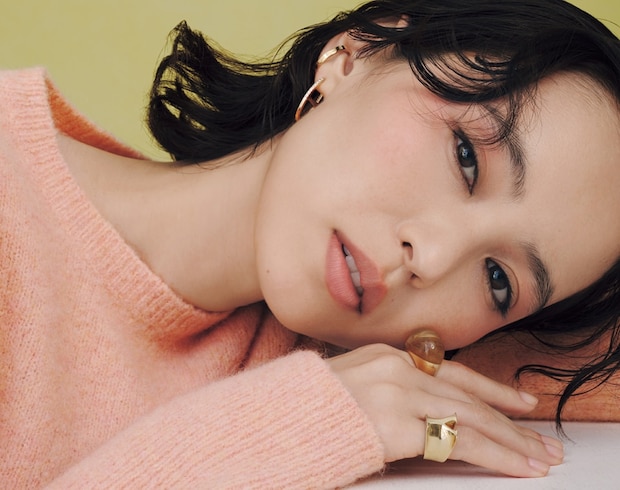 大人のピンクメイクと相性◎なゴールドのジュエリー。ゴツめデザインで甘さとバランスを