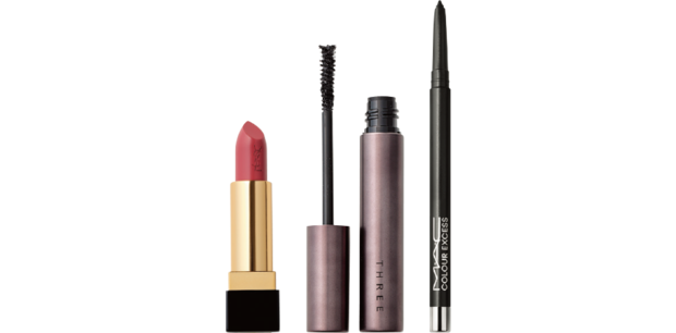 右から:濃密なカーボンブラック。カラー エクセス ジェル ペンシル グライド オア ダイ ¥3,960(M・A・C)、ソリッドなブラック。ワイズアイズパースペクティヴ マスカラ01 ¥4,400(THREE)、サテン質感のソフトピーチ。ルージュ ピュールクチュール N5 ¥6,050(イヴ・サンローラン・ボーテ・12/1発売)