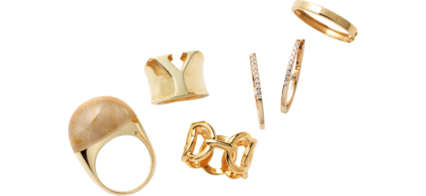 着ける場所によって、さまざまな表情で楽しんで。上から時計回り:イヤーカフ[K18YG]¥36,300(ヴァンドーム青山/ヴァンドーム青山本店)、ピアス〈シータ〉[K18YG×DIA]¥510,400(ヒロタカ/ヒロタカ 表参道ヒルズ)、リング〈ゾディアック〉[SV925×YGメッキ]¥19,800(ヴァーミリオン/ヴァンドームヤマダ)、ストーンリング〈ロックリング〉[SV×K18ゴールドプレート×ルチルクォーツ]¥115,500(ボロロ)、“Y”リング[スターリングSV925×K18ゴールドプレート]¥95,700(ザ レタリング/エスケーパーズオンライン)