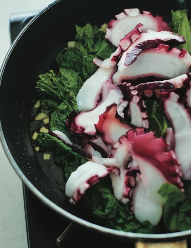 POINT 多めの油で蒸し煮にすると、菜の花が柔らかくなる。たこはかたくならないよう、フライパンに直接当たらないようにのせて。