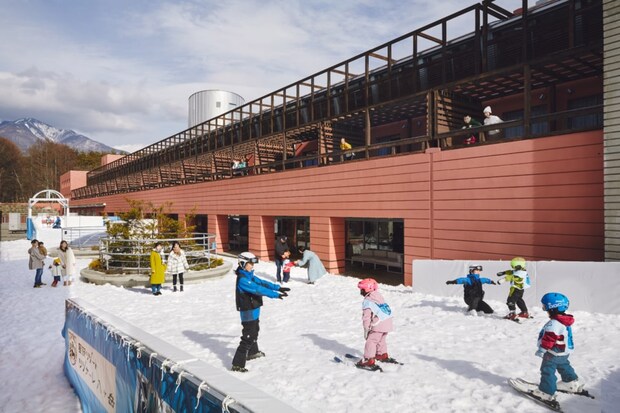 3歳から受けられるこちらのレッスン。レベル1の内容でスキー板をはいて止まる練習ができるそう。スキー場と同じリフトも設置されていて、リフトから降りて滑り出す練習も。