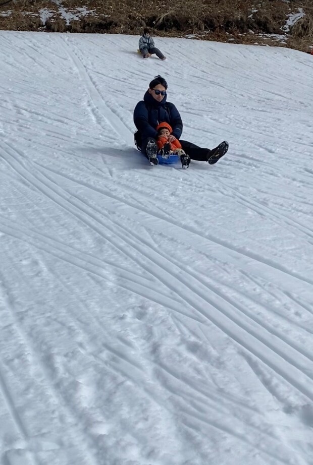 ソリは楽しかった様子。ソリ専用のゲレンデなので、安心して滑れます。スノーエスカレーターもあり、上に行くのも楽~。