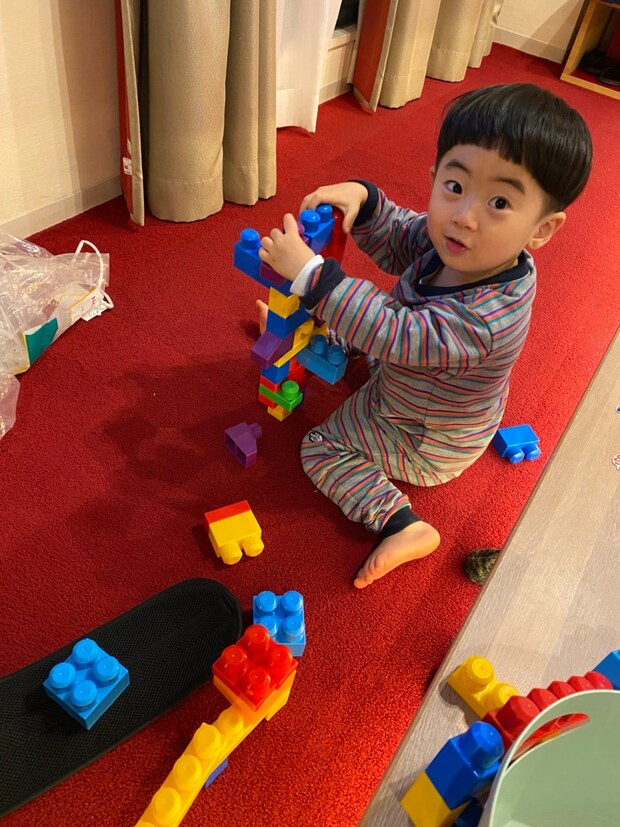 ホテルで貸し出してくれるブロック。お部屋にちょっとおもちゃがあるだけで助かったりするものですね。