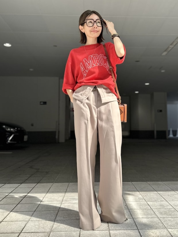 アメリカーナのフレッシュな赤のカットオフスエットをトラッドスタイルのハズしに。「今シーズンも引き続き赤など思い切ったカラー使いが気分です。スエットはスラックスやきちんと感のある小物と合わせるのが大人っぽく着るポイント!」