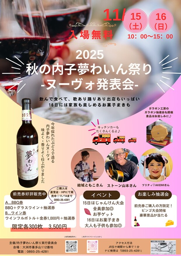 前売り券は内子ワイナリー直営店(0893-25-4281)で販売しているので、気軽にお問い合わせしてみてくださいね。
