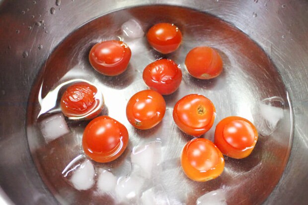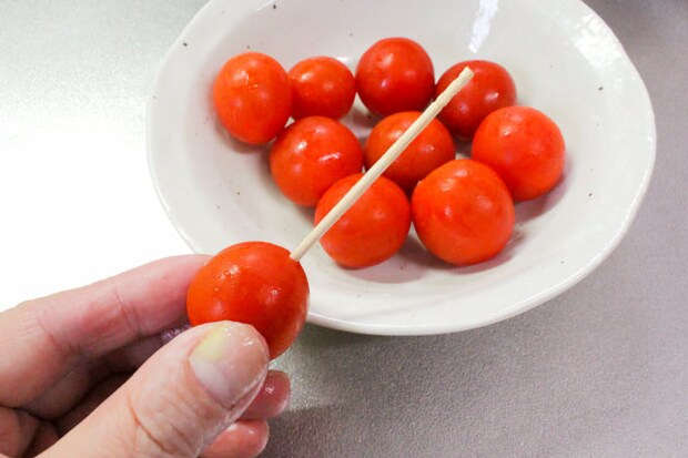 トマトのお尻に爪楊枝で穴を開けておくと、スムーズに皮がめくれるそうです。ぶどうを茹でた後のお湯で、ミニトマトも30秒ほど茹でました。