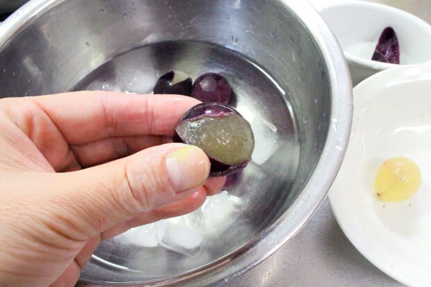 お湯から出してすぐ氷水に浸けると、皮が自然に弾け、ぶどうの実が見える状態に。指でつまむと、スルッと皮が剥けました♪